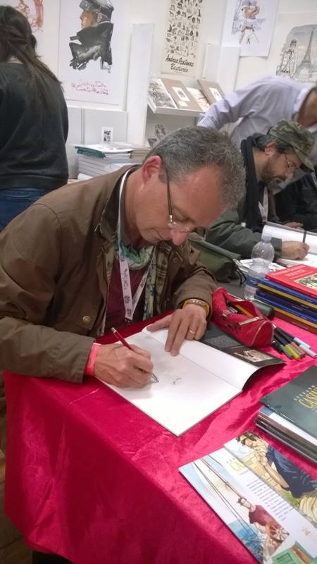 Allo stand de Il Grifo, ho condiviso lo spazio con colleghi illustri come Vittorio Giardino eJordi Bernet, che non conoscevo e che erano anni che non veniva in Italia, due presenze illustri con cui mi sono sentito onorato di dividere lettori ed appassionati, tuttavia è con amarezza che devo constatare che, per quanto illustri, alla fine non è che ci fosse quella ressa che in altri periodo ed in altri anni si sarebbe verificata alla presenza di due personaggi di questo calibro.