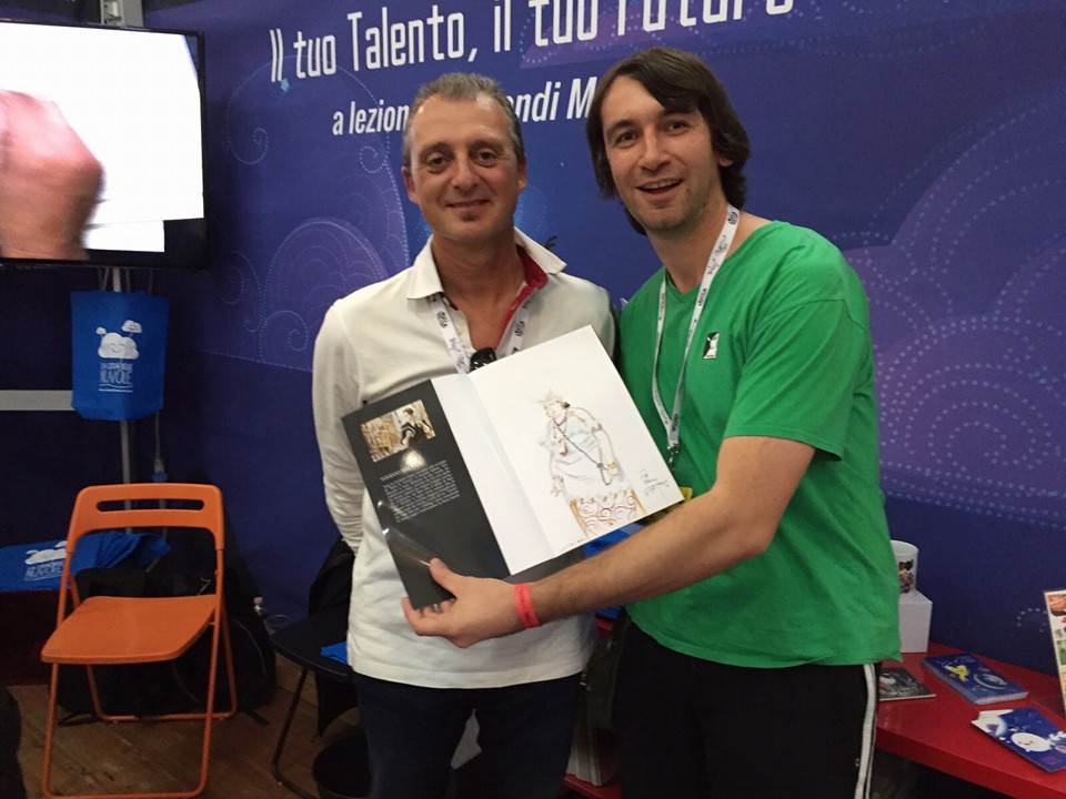 Dopo essere transitato per lo stand della mia scuola: l’Accademia Nemo, presso lo spazio Games, come di consueto è giusto il tempo di salutare John Nevarez, character designer e storyboarder americano di cui abbiamo realizzato un volume ed organizzato workshop per i nostri studenti (e con il quale ho cenato il venerdì sera), mi sono diretto verso piazza Napoleone in direzione Il Grifo Editore, dove avrei dedicato i miei libri, seppur prodotti dalla mia scuola, presso lo stand di Mauro.