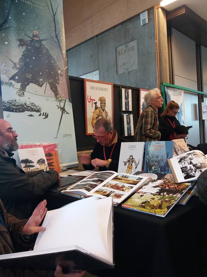 Poi il caffè in sala autori, dove scambiamo quattro chiacchiere tra noi prima di riprendere la sessione di dediche, già qualche autore comincia a salutare, siamo davvero tanti e alcuni non sembra di averli notati fino al momento dei saluti, Illzach rimane uno dei primi cinque festival francesi come importanza e quantità di autori. Qui ritroviamo Gradimir Smudja, amico di molte vicissitudini in terra francofona, di passaggio ma con sosta ad un festival che anche per lui è una tradizione, ci siamo venuti insieme molte volte, è all’inizio di uno dei suoi tour che si lascia organizzare dalla casa editrice per promuovere il suo nuovo libro di linea “jeunesse” realizzato su testi di Wilfrid Lupano, uno sceneggiatore di grande lustro, per cui anche questo album si rivelerà sicuramente un successo. Scambiamo quattro chiacchiere e ci ripromettiamo di stare insieme almeno per la cena.