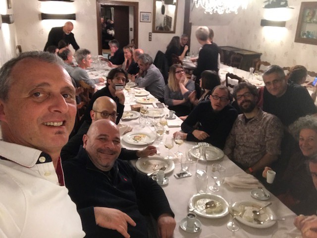 L’allegra brigata italica che per non sfigurare e farsi parlare dietro da sempre il meglio di sé a tavola: da destra il faccione del sottoscritto, poi dal basso verso l’alto Davide Fabbri, Roberto Zaghi (seminascosto) e Theo Caneschi che fa notare il riflesso fulgido della sua carta di credito, evidentemente riempita delle royalties incassate dal suo “Murena” già in testa alle classifiche, il ragazzo ce la fa pesare, di fronte a lui Daniela Di Matteo di nuca (devo dire che è presa bene) mentre evidentemente era più interessata a ciarlare con la sua vicina che ad essere immortalata per la storia, poi il Maconi con la faccia da deficiente perché non si dica che ha espressioni diverse da quelle, Matteo Alemanno, in piedi Pierre Frigau (in loco al momento, classico esempio di tempismo da scatto), con la tazzina in mano Monica, la compagna di Roberto Baldazzini che solo adesso mi accorgo di quanto sia preso bene il suo occhio destro. Mi accorgo adesso che manca anche Angela, la moglie di Davide, porca miseria, spero non me ne vorrà.