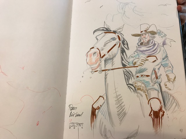 Alla fine della giornata ci ritroviamo vicini alla libreria della manifestazione, e qui incontriamo Smudja che finalmente è arrivato, e che perderemo fino al giorno dopo, ma scambiamo opinioni sul nostro mestiere, modalità di lavorazioni con Matteo e Gianluca Maconi e scopriamo che Theo Caneschi ( che adesso, dopo la morte di Philippe Delaby, il precedente disegnatore, è passato alla realizzazione di Murena, una serie di grande successo scritta da Dufaux) realizza le sue matite in formato piccolissimo e dettagliato per poi ingrandirlo e ripassarlo in seguito, parliamo di carte, penne e colori, insomma, tutto l’armamentario del mestiere.