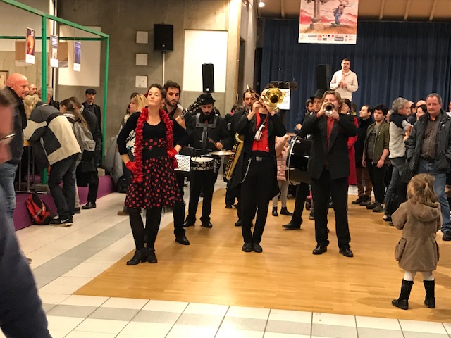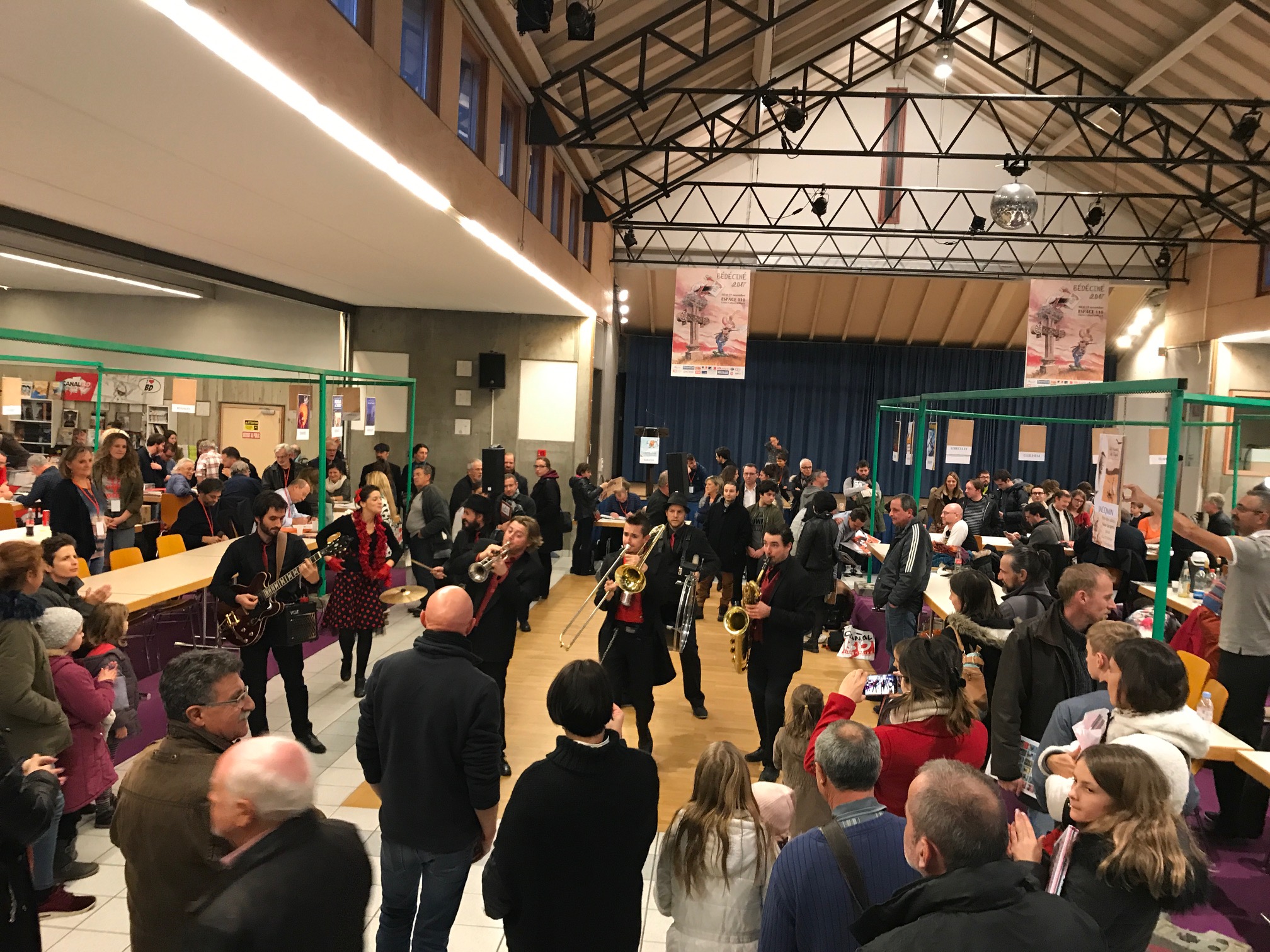 Salutiamo Pierre Frigau che se ne ritorna verso Strasburgo, il suo ruolo di assistente agli autori italiani sta finendo e deve rientrare, tra chiacchiere ed un bicchiere di quello che per noi è uno spumantino come aperitivo, ci avviciniamo alla cena che si svolge a buffet, e nonostante tra autori e bénévoles siamo in numero molto consistente al punto da riempire completamente lo spazio ristorazione, che è davvero grande, la fila al buffet si svolge con ordine e velocemente, e tra una chiacchiera e l’altra, dove Gradimir a stecchetto di chiacchiere con noi da il meglio di sè, raccontando episodi che abbiamo condiviso, ma il tutto ammantato di una stanchezza tangibile, ci avviciniamo al commiato generale. Salutiamo Denis (il direttore della manifestazione) e qualche volontario dell’organizzazione (pare che siano oltre un centinaio) e ci dirigiamo o verso il bus navetta che ci porta all’albergo.