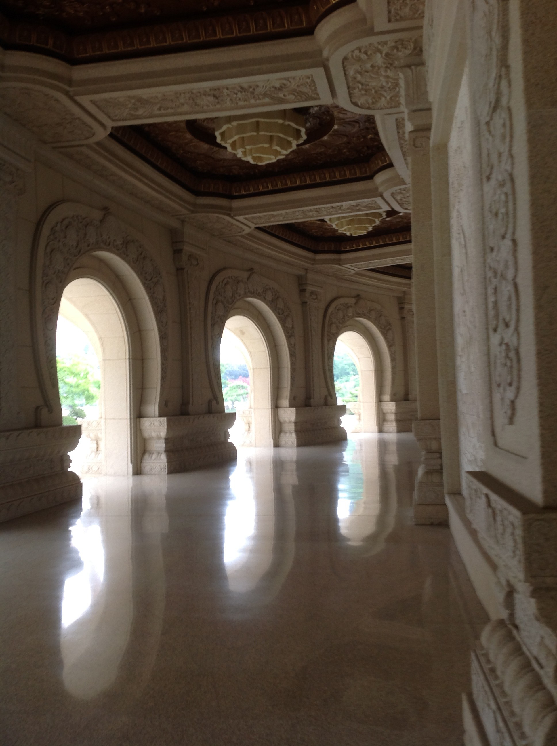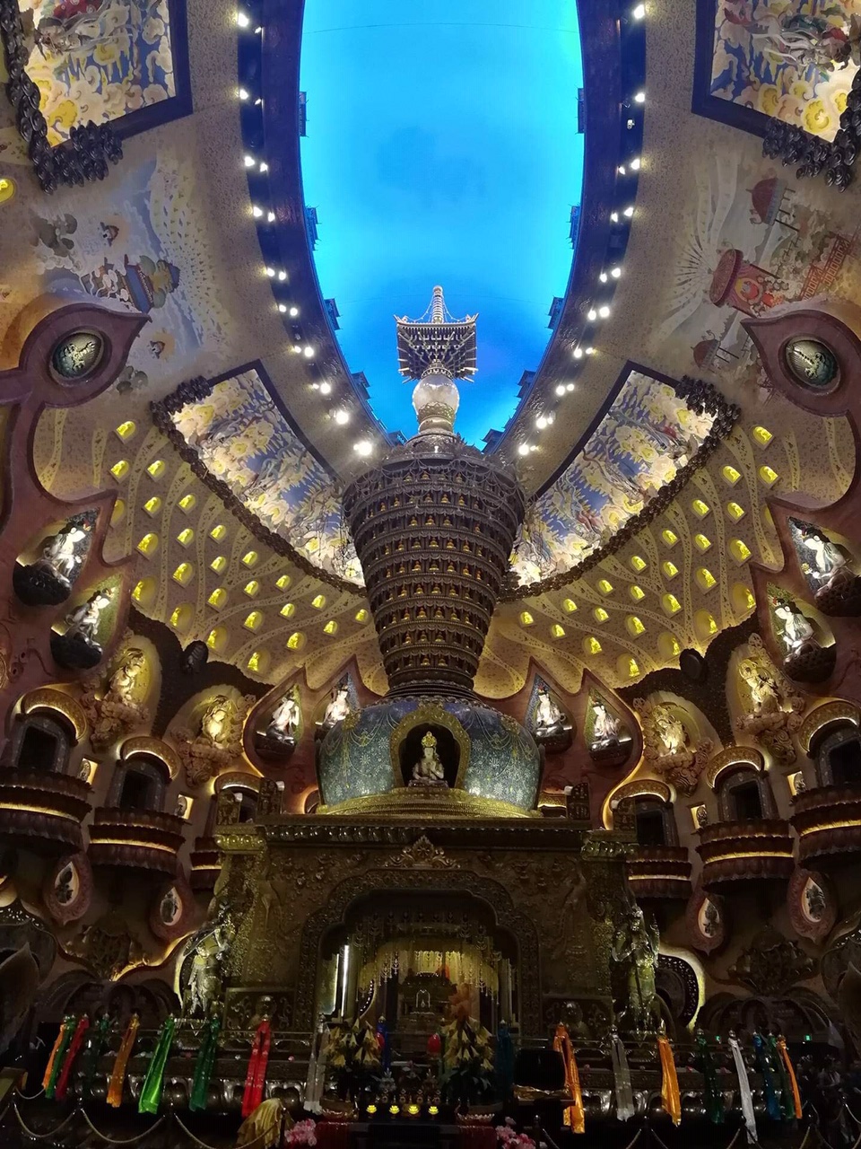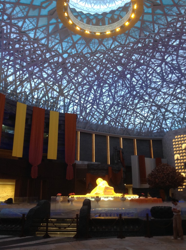 All’interno in una grandissima sala giace un Buddah sdraiato, completamente illuminato con la volta del grande tempio illuminata di bile che fa un grande effetto scenico, e poi due alberi laterali, il tutto è suggestivo e di grande impatto ma particolarmente kitsch. Io come al solito per paura di non avere tempo, mi fermo a disegnare uno scorcio che si vede da una delle tante volte, mi siedo e comincio. Così facendo mi perdo però il pezzo migliore, e cioè la statua del Buddah in piedi immersa nei cinque piani sottostanti, tra l’altro raggiungibili con ascensori.