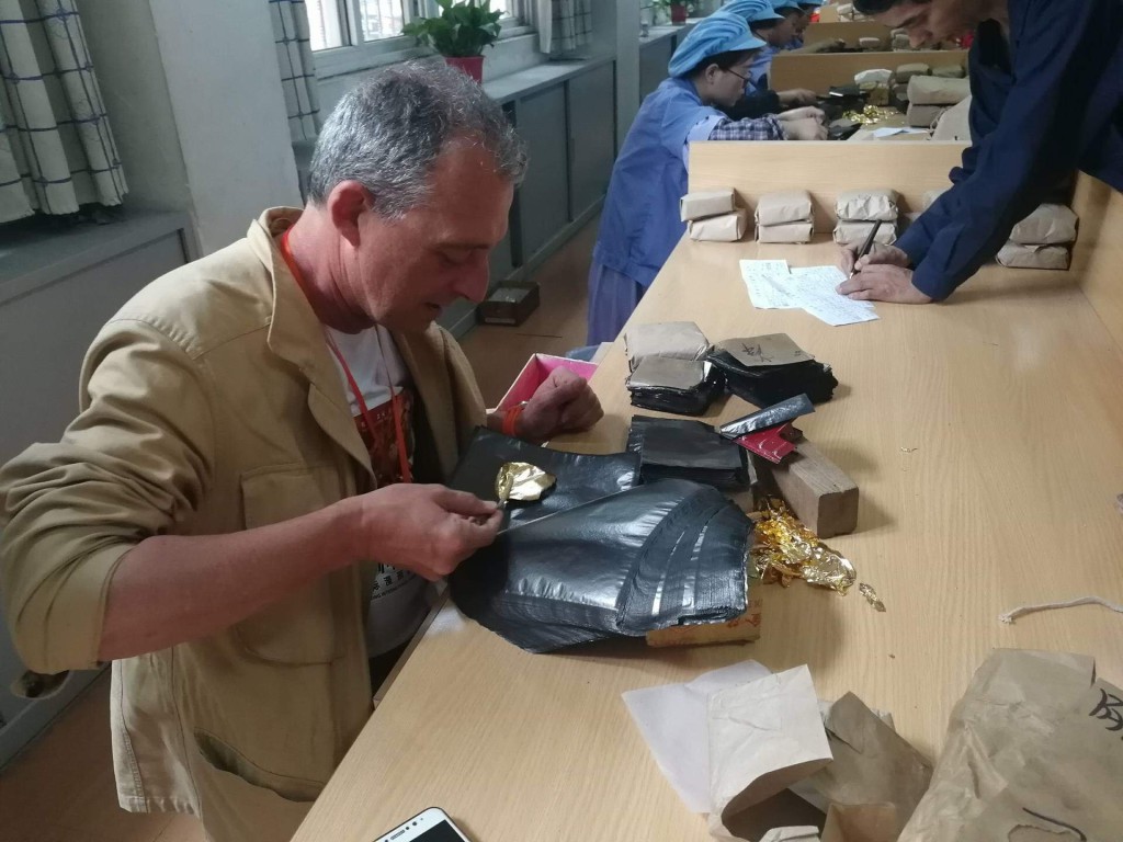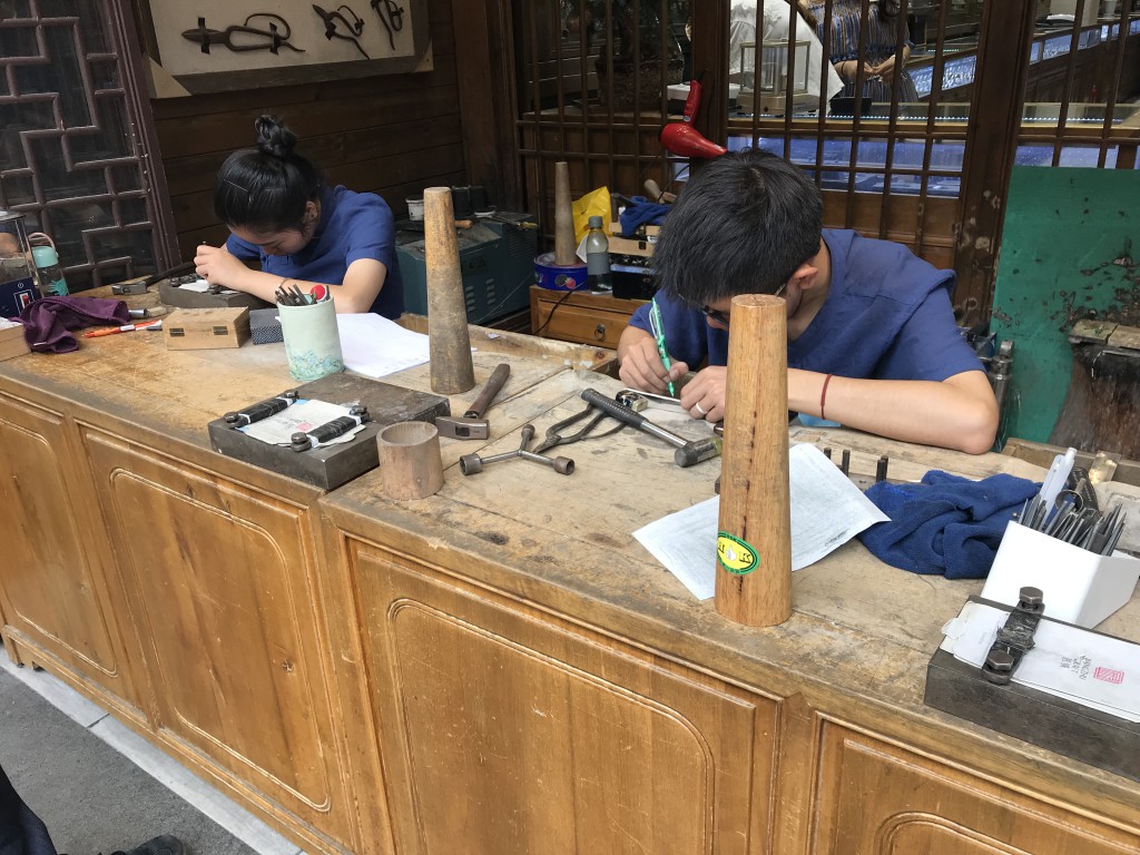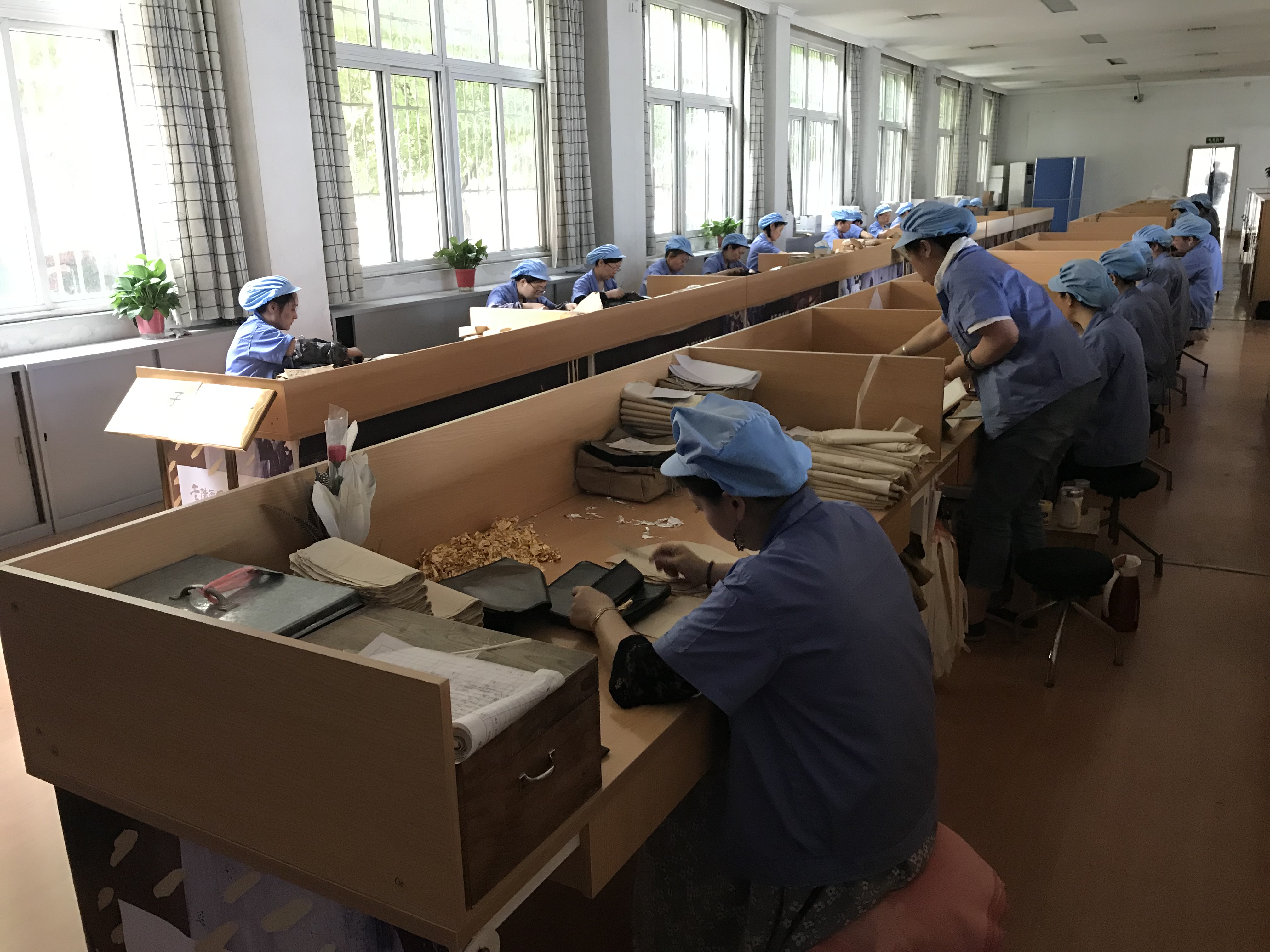 Tutte queste interessanti spiegazioni, c’è le ha date una ragazza occidentale che al primo momento pensavo fosse francese, perché l’avevo sentire per un attimo scambiare due parole con Nicolas, per poi continuare in inglese che pare le venisse più facile. Dopo qualche minuto però, mentre osservavo le soffiatrici e aver scambiato due parole con Stella che mi segue sempre passo, dopo passo, si rivolge a me dicendomi “ah, ma lei parla italiano? ” al che rispondo ” Be’ no, io non solo parlo italiano, io sono italiano…”, scoprendo così che si chiama Viviana Bertanza ed è di Brescia, e così per tutto il tempo abbiamo fatto coppia fissa, un’altra guida dava ulteriori spiegazioni ed io, sfruttando la lingua e il fatto che avevo intuito che non vedeva l’ora di parlare un po’ la sua lingua, abbiamo fatto coppia fissa fino alla fine della visita. Viviana, tra le varie esperienze che la vita gli ha proposto, è una di quei ragazzi che ha colto l’opportunità di provare ad inventarsi qualcosa di nuovo in un paese straniero, neanche tanto facile perché lo studio del cinese, è piuttosto complesso. Essendo un aspirante pittrice, in un viaggio in Cina dove risiedeva un parente, è stata notata ad una mostra di suoi quadri dal titolare della fabbrica, un giovane imprenditore che, come ogni buon cinese che erediti un’attività, se ne fa carico e procede nel lavoro di famiglia, questi gli offre di lavorare per lui, nell’area “creativa”. Lei usava già nei suoi dipinti le foglie d’oro, e questo particolare ha suggerito al titolare di proporle un lavoro.