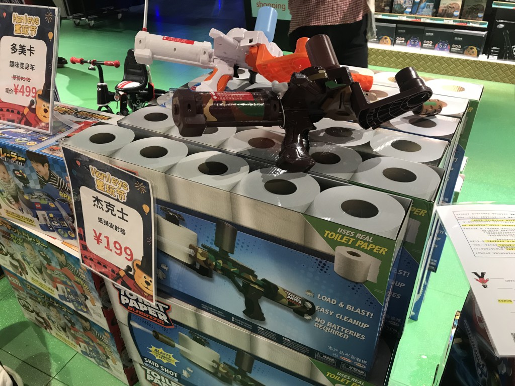 Natura morta con moto di Nanchino, sopra, nel grande negozio di giocattoli Hanley’s, uno spara rotoli di carta igienica, un implicito insulto scatologico verso i nemici.