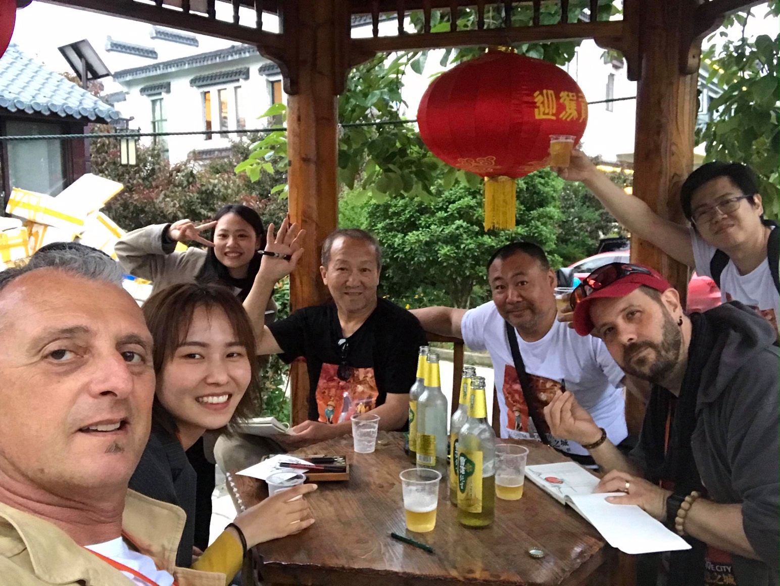 Una sosta prima della cena, sotto un gazebo nei pressi del ristorante, da sx: io, Stella, una studentessa, Wan Kwei, Wangning, Nicolas e l’amabile interprete di Nic, Raphael.