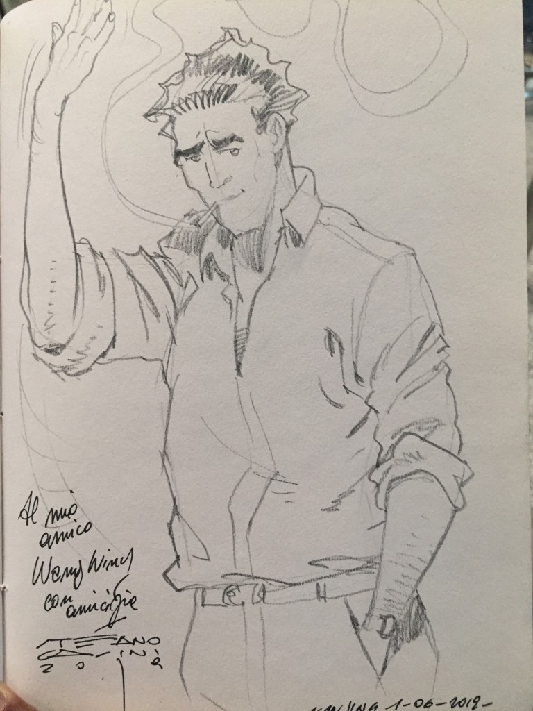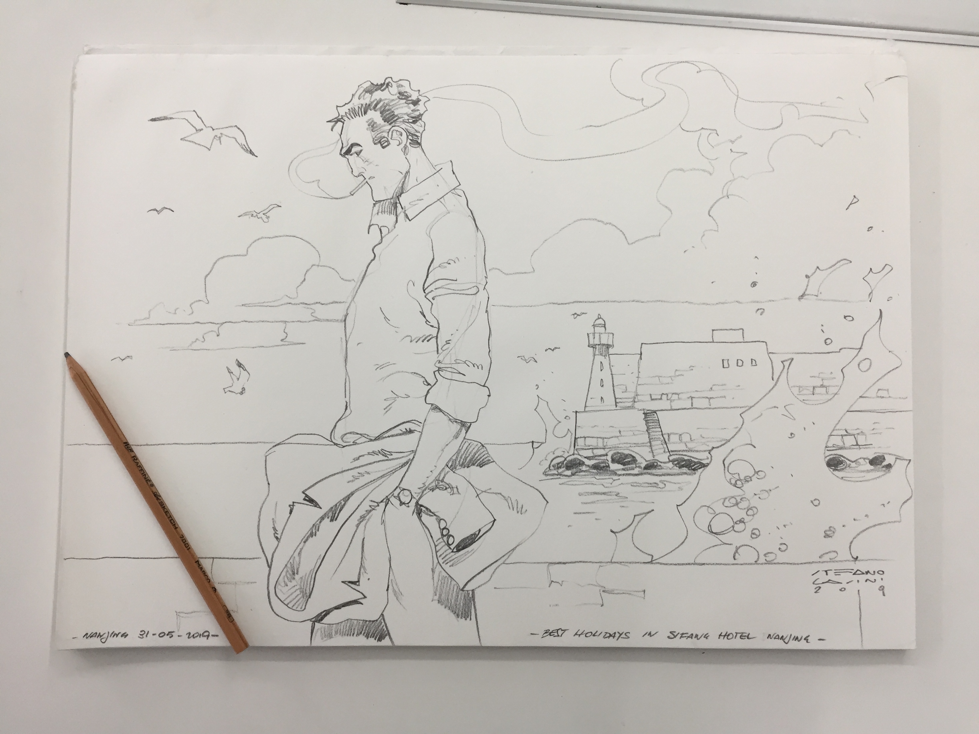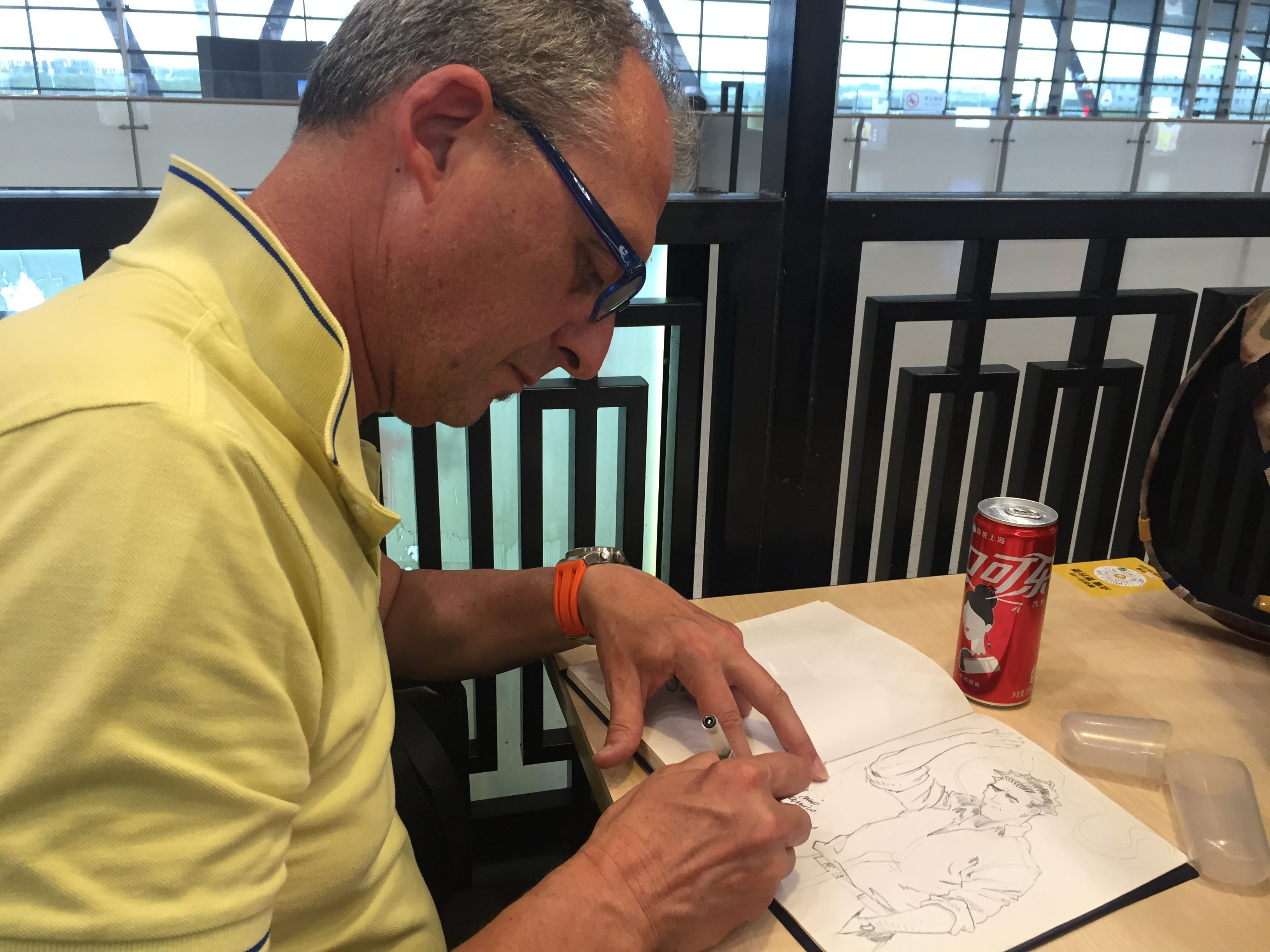 Wang ci ha accompagnato fino al check-in, poi una volta fatto siamo saliti ad un bar per l’ultimo saluto anche con lui, e sia io che Nicolas gli abbiamo realizzato un disegno sul suo libro d’oro, un’abitudine che deve aver preso dalla frequentazione del mercato francese, dove si colleziona tutti i disegni dedicati da amici disegnatori che, in un modo o nell’altro, ti piacciono o che conosci. In questo viaggio ho anche conosciuto molto meglio Wang, che è un tuttofare per quanto riguarda organizzazione e pianificazione di questo tipo di iniziative, oltre a lavorare e nell’editoria (a Beijing mi ha presentato il suo capo), non saprei molto bene definire quello che fa oltre a questo, ma è una persona molto attenta, capace e simpatica, si fa in quattro per te e cerca di risolverti ogni problema oltre a soddisfare ogni tua esigenza, e poi è un compagnone, fa una battuta dietro all’altra e adora ridere, per tutto il viaggio ci scambiavamo gesti, perché adora noi italiani che gesticoliamo quando parliamo (anche qui ho dato lezioni di italiano per non udenti), cercando di affiancare al gesto la frase giusta, quando lui generalmente le metteva ad capocchiam. È stato insieme a noi fino alla fine, noi non abbiamo tirato fuori un euro, e anche ieri quando si è trattato di venirci incontro per il trasferimento del compenso, nonostante fosse sfiancato dalla sveglia alle prime ore dell’alba, ci è venuto incontro ed ha risolto il problema. È davvero una brava persona, così come sono stati accorti e gentili tutte le persone che ci hanno seguito, sempre con il sorriso sulle labbra trattandoci come dei veri principi.
