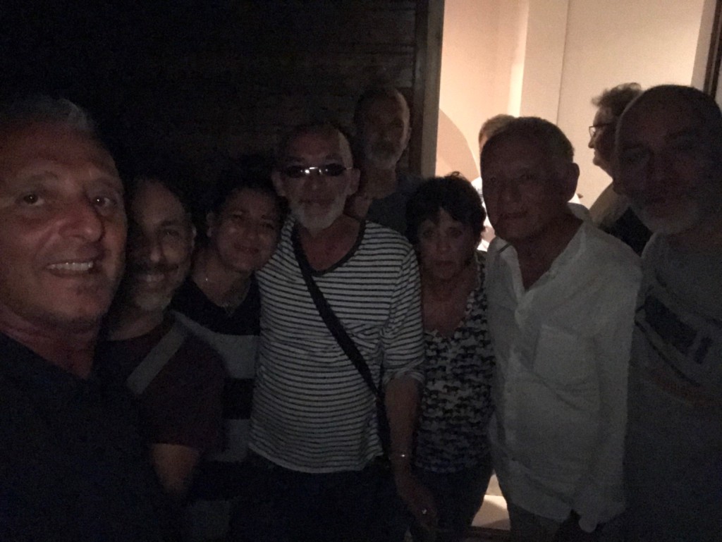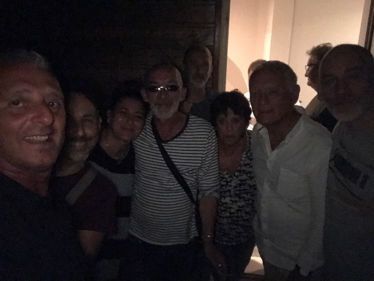Alla ricerca di una frescura trovata soltanto sulla terrazza del ristorante tenuta premurosamente al buio, onde evitare sprechi di energia inutili e qui, alla fioca luce di un flash in crisi d’identità da sx: il narrante, Vincenzo, Simona, Christophe, Jacques Térpant, Marick Bouvy e Michel Pierret, in secondo piano un volontario, e Alessio.