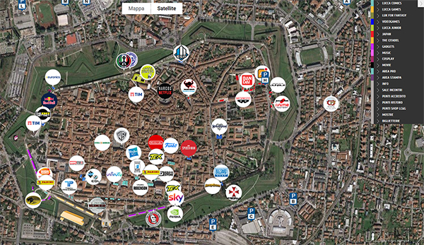 La mappa di Lucca con la dislocazione dei padiglioni e punti eventi del territorio urbano.
