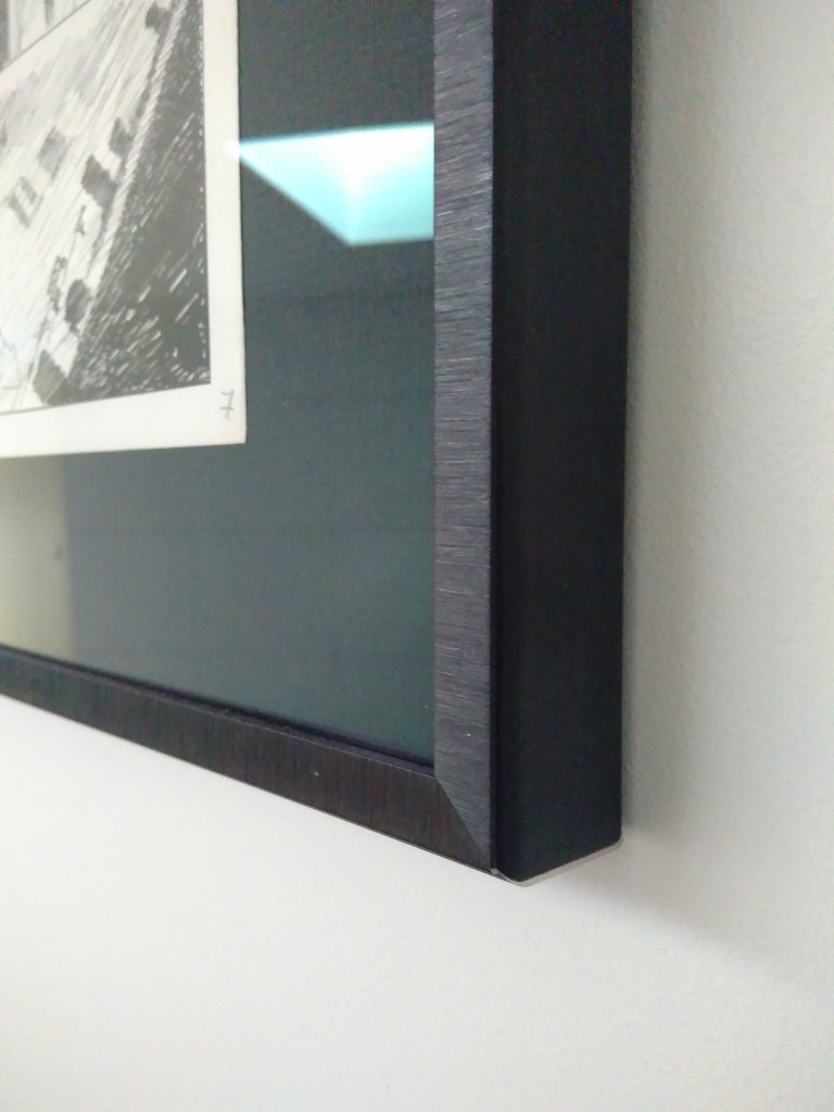 E’ passato quasi un anno e mi ha ricontattato una decina di giorni fa, scrivendomi un’appassionata email e inviandomi le foto della cornice, spiegandomi i motivi della scelta del passpartout e del vetro anti-raggi UVA, e ragguagliandomi nel punto dell’appartamento dove l’aveva appeso, e cioè in mezzo alla sala, il punto più importante.