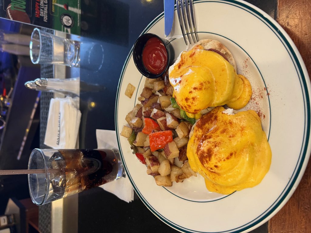 La corposa colazione all’americana, con l’uovo in camicia, salsa olandese (il bacon è nascosto dall’uovo) e le classiche patate col ketchup, un inizio di giornata corroborante e ricca di calorie.