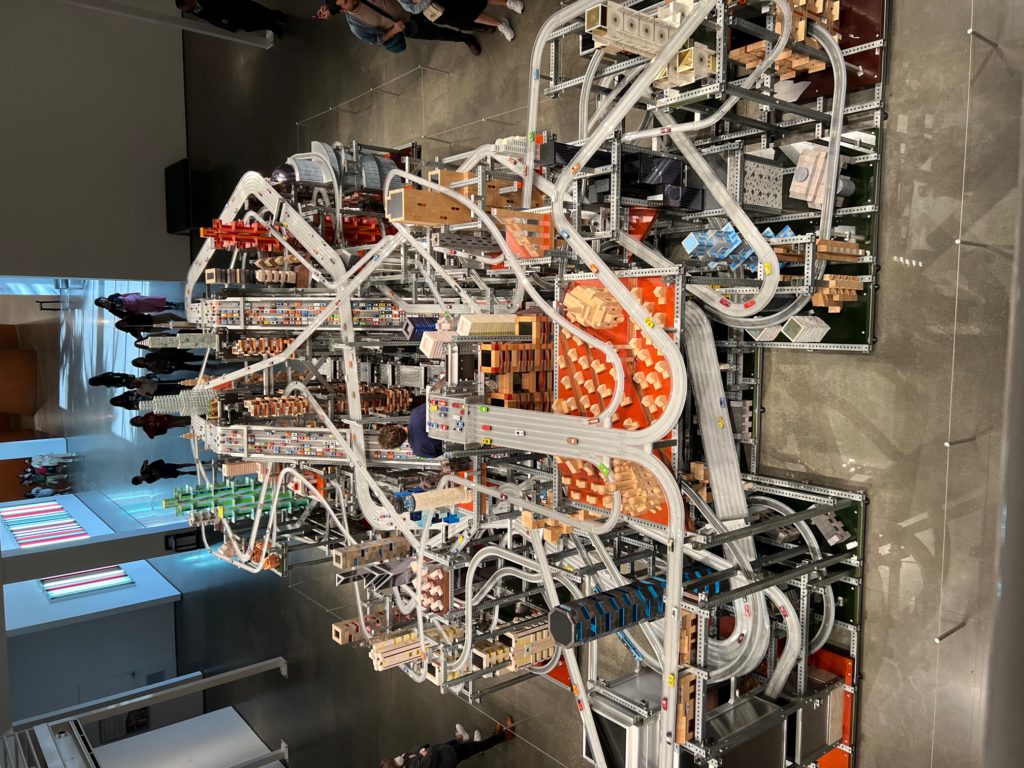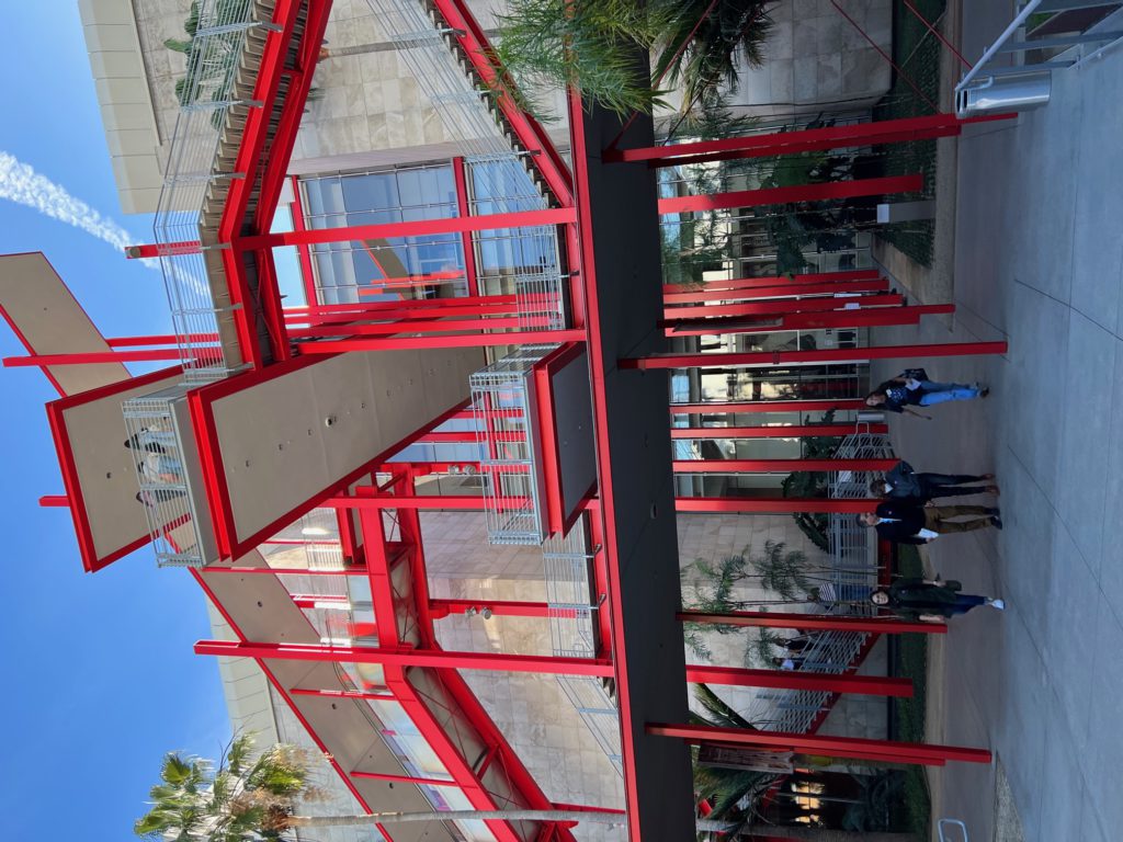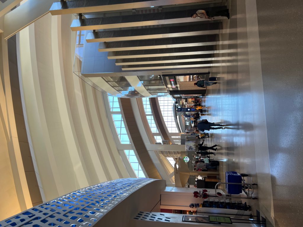 Noi dobbiamo salire all’ultimo livello, il più alto, e lo facciamo accedendo da scale mobili che attraversano in diagonale l’enorme atrio, dandoci una prospettiva dall’alto e una visione esterna dei maxischermi attraverso i vetri, davvero suggestiva.