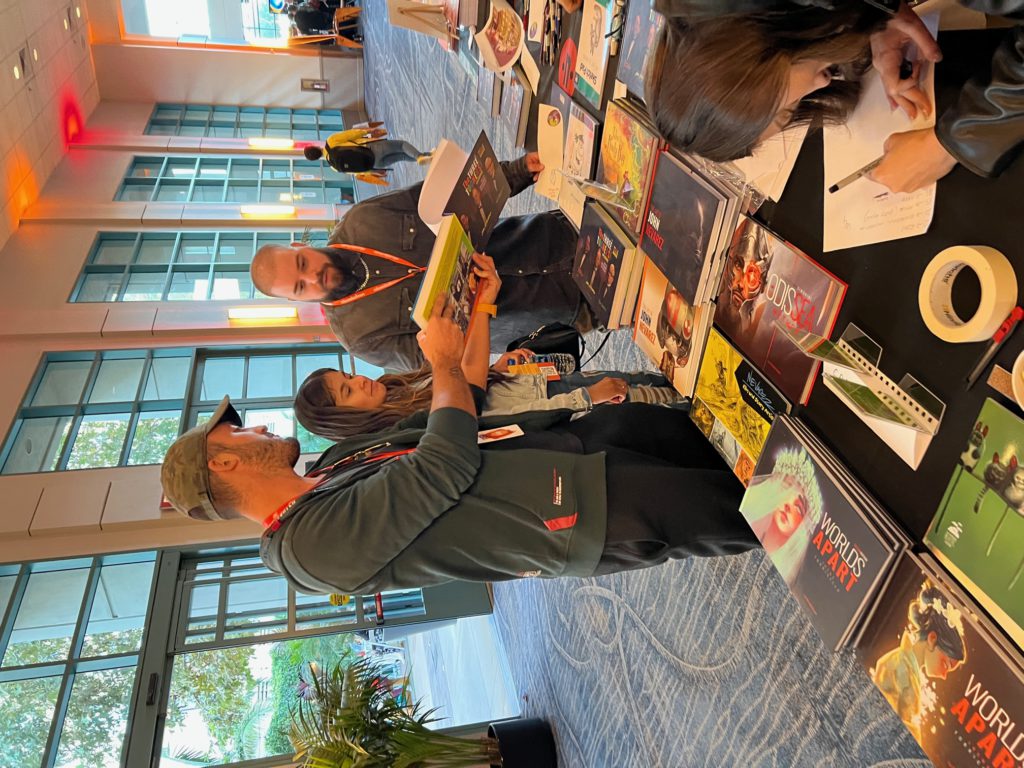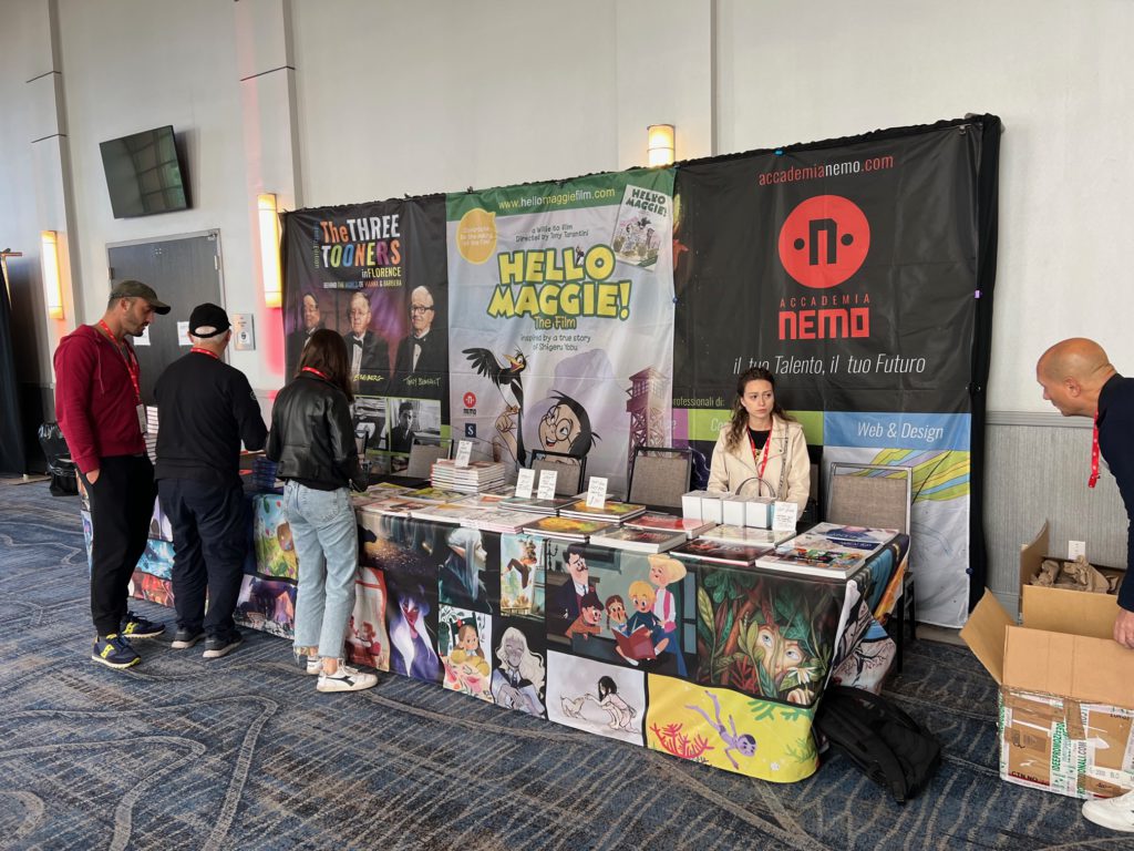 Nel pomeriggio la musica non cambia, oggi tutta la giornata al CTN, Toni Benedict è tornato a casa insieme a Kathleen e il carosello che si alterna intorno allo stand è sempre molto concitato. Si presenta a noi un illustratore/animatore francese ma che vive negli USA e ci fa vedere un piccolo pitch molto bello di una produzione che vorrebbe realizzare, e rimaniamo colpiti dai disegni e dalla qualità delle immagini, e speriamo o di poterlo aiutare in qualche modo. Ci sono un sacco di giovani artisti a caccia di nuove opportunità, i tavolini dei recruiters sono sempre affollati di studenti che mostrano il loro portfolio, è una circostanza in cui si creano connessioni, ci si conosce e si spera che il proprio lavoro interessi a qualcuno che ce lo promuova e lo valorizzi.