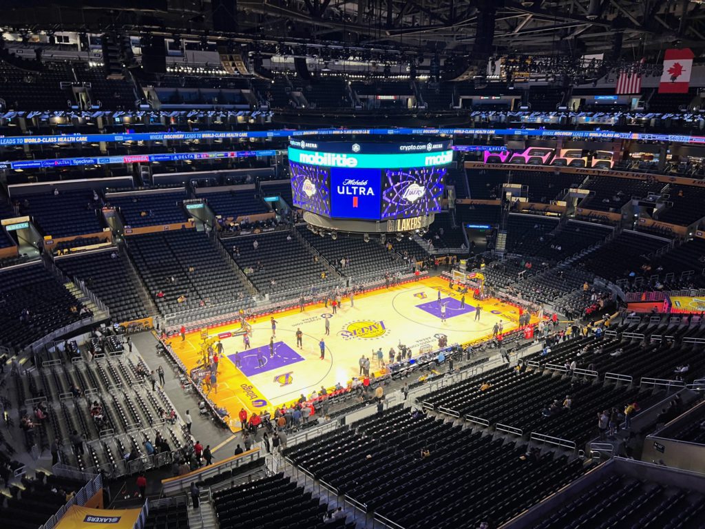 Dall’alto i palazzi di fronte alla cripto.com Arena, in occasione della partita di campionato dei Lakers contro i Detroit Pistons, gli enormi video che sovrastavano ed illuminavano la via, l’ingresso dell’Arena e la vista dal primo anello del campo di gioco.