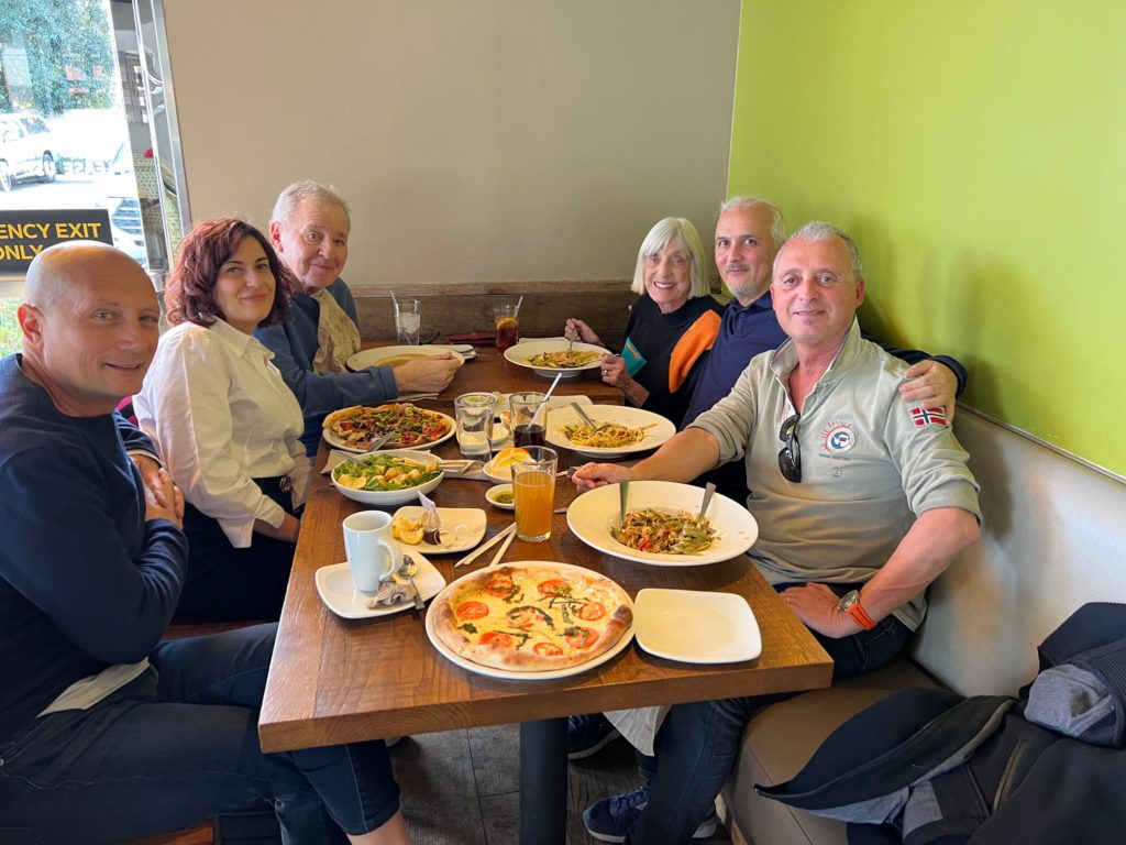 A pranzo dopo un’intensa mattinata di interviste, da sx: un emaciato Fabrizio, Eleonora, Jerry, Roymonde, Luca ed io, davanti a pizza e spaghetti all’americana (Tijuana).