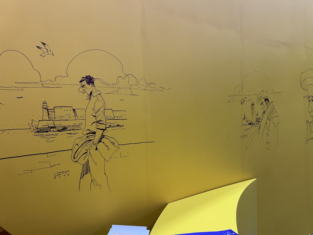 Lo spazio adiacente al nostro stand presentava una lunga parete di colore giallo di almeno una trentina di metri al che, ci viene suggerito da Pinetti, di incominciare a farci disegnare gli autori e rendere vivo quello spazio regalandogli una funzione social. I primi ad iniziare siamo io e Sandro Cleuzo, che siamo lì come guardie svizzere a presenziare lo stand nell’attesa che Sandro vada al suo appuntamento, e cominciamo a disegnare ognuno sui due lati dello stand. Curiosamente, e in modo almeno da parte mia totalmente inaspettato, i miei disegni ottengono un grande successo e cominciano a piovere, anche da me, curiosi, estimatori e personaggi d’ogni tipo a chiedere informazioni, quando credevo di fare più da spettatore che altro.