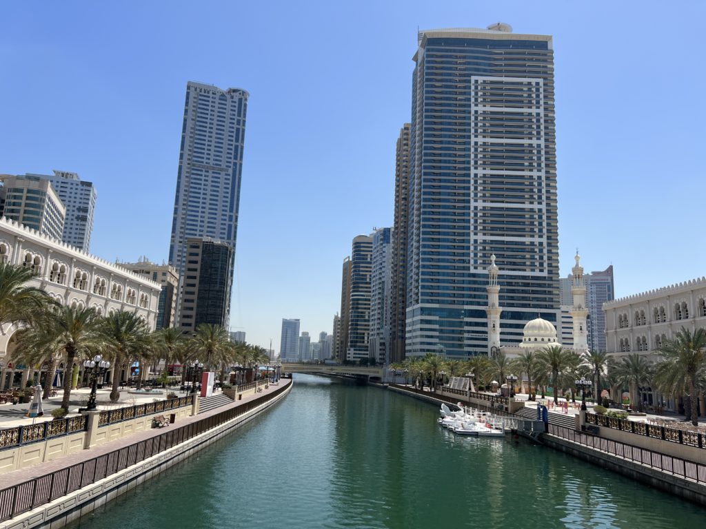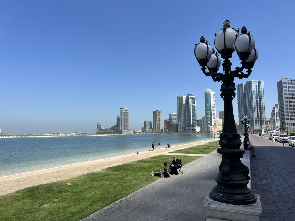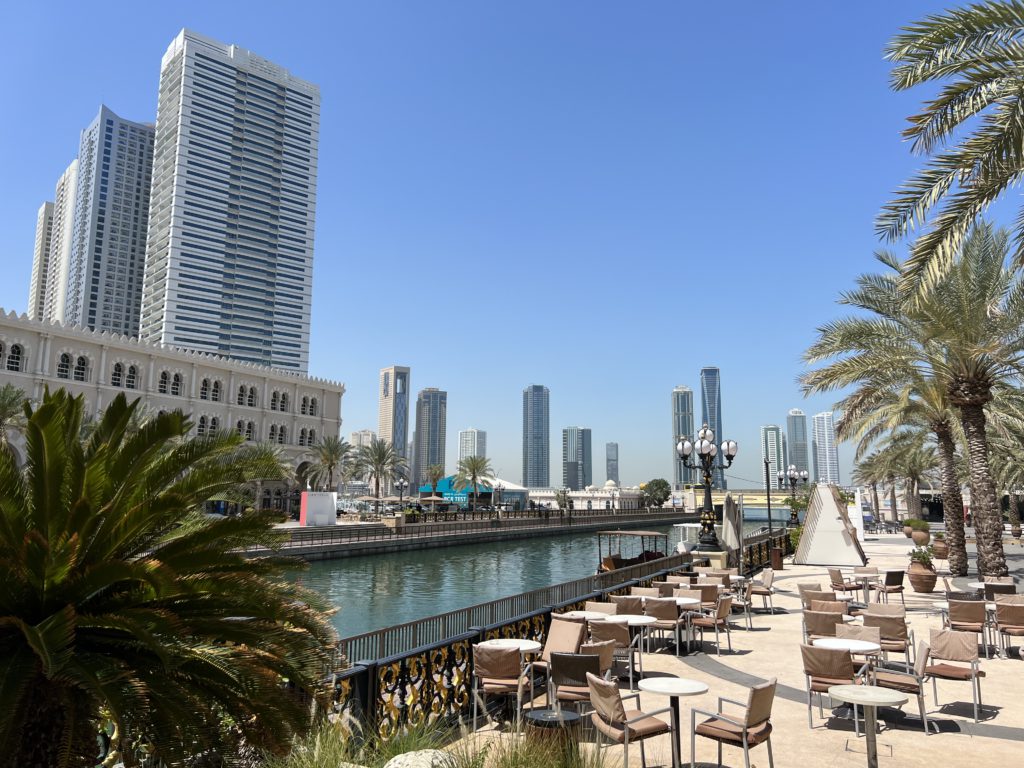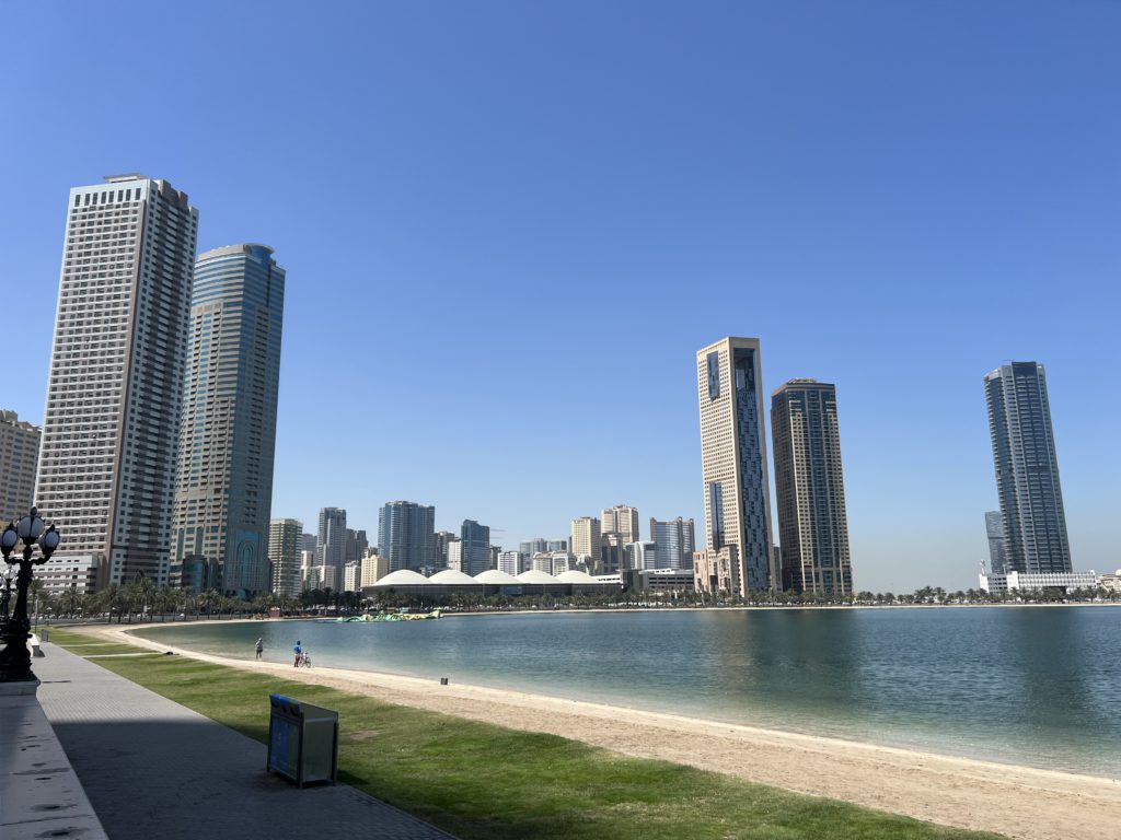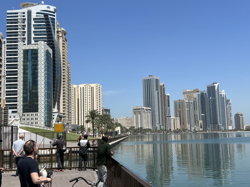 La mattina del terzo giorno era libera, per cui, nell’impossibilità di visitare l’antico suk di Sharjah, perché bloccato da lavori di ristrutturazione, abbiamo pensato di chiedere alla reception un consiglio su cosa vedere lì vicino (poco in realtà). Siamo perciò partiti per una passeggiata che girava intorno al bacino artificiale su cui è costruita quella parte della città. Sharjah è la capitale culturale degli Emirati ma, nonostante questa vocazione, come Dubai condivide l’idea di sviluppo verticale delle proprie abitazioni, e l’idea si sviluppa con un unico concetto, immaginabile anche per i meno intuitivi: e cioè che i palazzi, dall’architettura ultramoderna, vanno tutti ben oltre i trenta piani, con il risultato di avere uno skyline degno di New York.