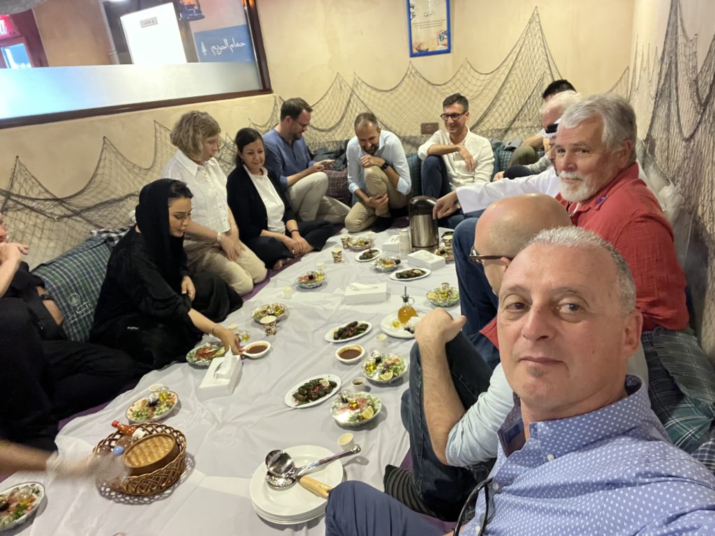 All’interno, con una disposizione diversa nei ristoranti ai quali siamo abituati, si vedono pochi avventori (probabilmente nascosti in stanzette private) ma molti camerieri, e veniamo fatti accomodare in una saletta che dovrebbe contenere tutti gli ospiti. A me sembra che lo spazio non possa contenerci tutti, ma forse è solo una mia superficiale impressione. La stanza è isolata dalle altre con una porta, e dispone di finestre che danno sul corridoio interno, ha per terra una sorta di enorme tatami, sul quale sono adagiati dei teli che simulano delle tovaglie e, a distanza regolare, dei piatti con delle insalate miste, incappucciati da pellicole trasparenti. Qui il capo della manifestazione, incorniciato da kefiah e abito lungo completamente bianco, ci saluta presentandosi e facendoci accomodare alla spicciolata, così come arriviamo in relazione all’arrivo della auto. Lo spazio per “inginocchiarci” all’indiana (e cioè a gambe incrociate), non è molto ampio, poi parte la “tovaglia”, il tutto mi sembra piuttosto striminzito, ma con spirito ospitale ci accomodiamo.