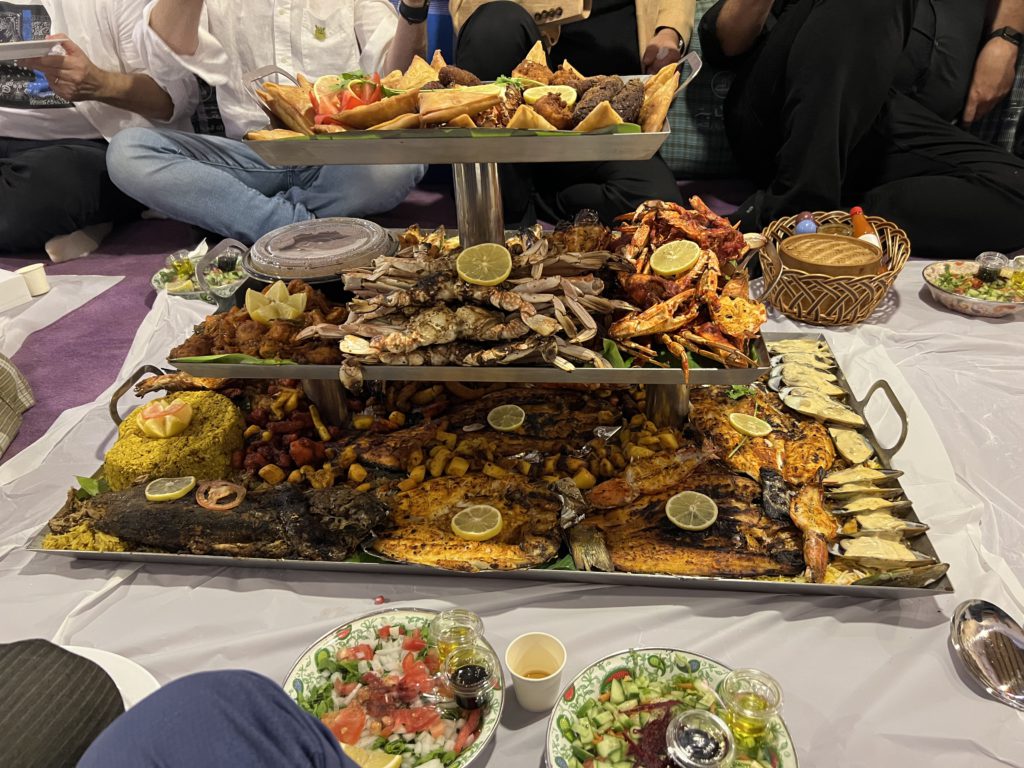 Pranzo tipico di cucina araba, qui sopra, uno dei vassoi a disposizione dei commensali.