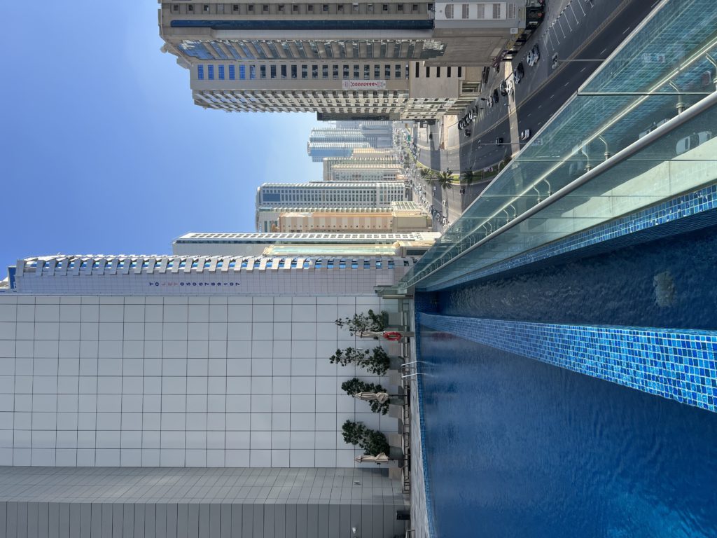 Trascorro un paio di ore di relax, e faccio il bagno proprio quando il sole, nascosto dal palazzo di fronte, fa capolino e irradia i suoi raggi concedendo luce e calore allo specchio d’acqua, e mi rilasso così per un po’, guardando il traffico dall’alto mentre faccio il bagno.