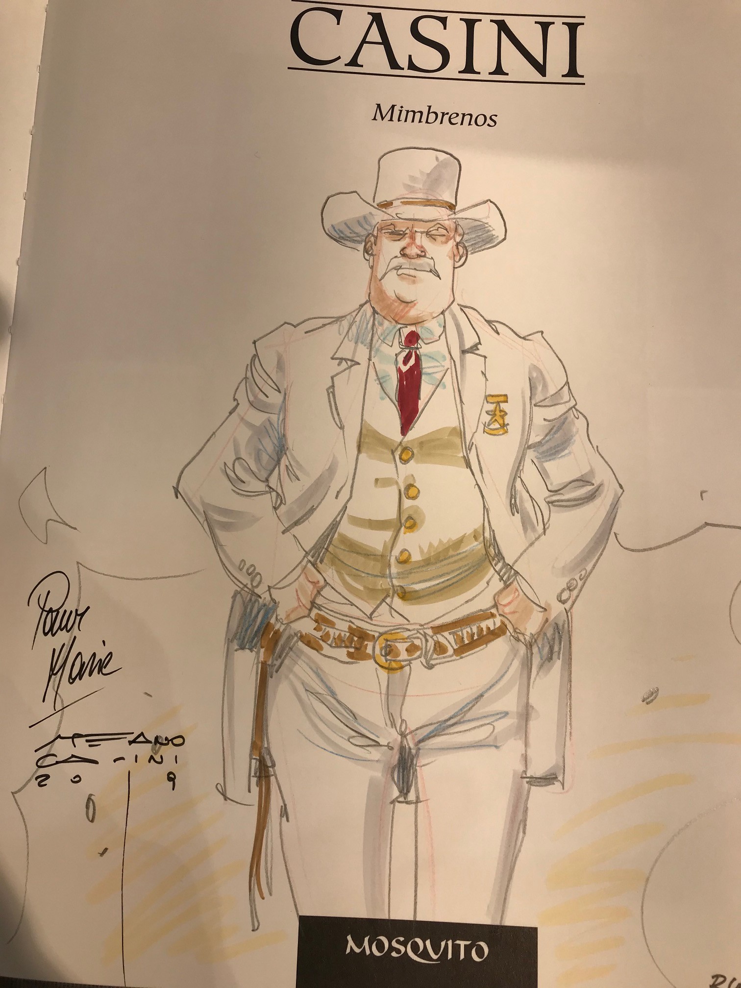Quest'anno con me e accanto a me avevo Sergio Tisselli (che ha pubblicato con Mosquito il Tex che ha realizzato per la Sergio Bonelli Editore nella versione Color, in un formato però che meglio esalta le qualità del lavoro, e cioè nella dimensione del cartonato e non del pocket all'italiana), Tisselli che nonostante l'età e l'esperienza è abbastanza novizio a queste scorrerie d'oltralpe, per quanto abbia, secondo me, un disegno piuttosto adatto al mercato francese, specialmente quello esigente dei collezionisti, lui che ha un acquerello fluido e coinvolgente che ben si adatta ai gusti transalpini. E in questi giorni ho letto nel suo entusiasmo per la novità e per un apprezzamento al proprio lavoro, la gioia dell'autore poco abituato ad una full immersion di dediche, tra lettori esigenti e bramosi di novità. Dentro ad ogni autore si cela il bambino che ha bisogno che la mamma gli dica "bravo" ed il mercato francese per del sue modalità intrinseche, fa la facente funzione materna, con i suoi lettori che, se ti apprezzano, hanno mille modi di dimostrartelo mettendosi in fila ed attendendo pazientemente il loro turno, ed organizzando manifestazioni ad hoc per soddisfare queste esigenze. Ecco, Sergio aveva trovato la sua mamma, glielo si leggeva negli occhi, nella modalità della chiacchiera e nell'uso di un francese che non conosce ma che scazza con disinvoltura di chi se ne frega perchè è contento di essere lì, e sono molto felice per lui.